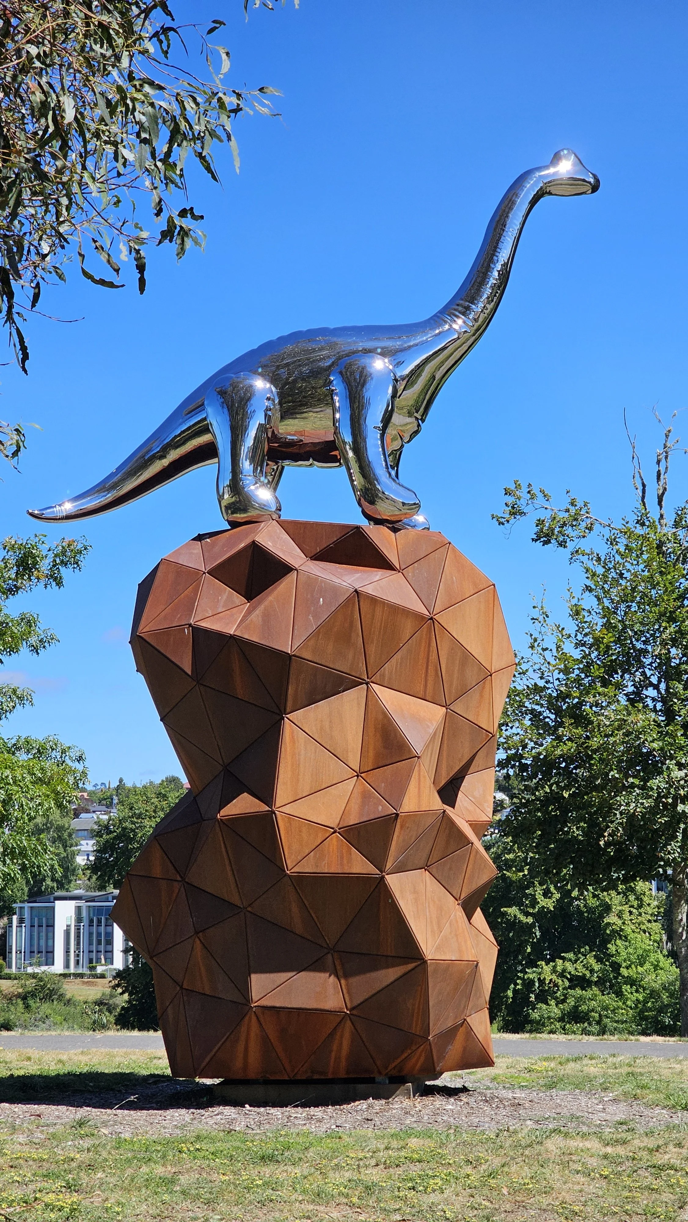 Artist Gregor Kregar says the large rock in his sculpture relates to the giant boulders ejected by the volcanic force of Taupō’s historic eruptions. The mirror-polished stainless steel Sauropod dinosaur is based on an inflatable toy and represents the town’s playful ‘holiday destination’ aspect.