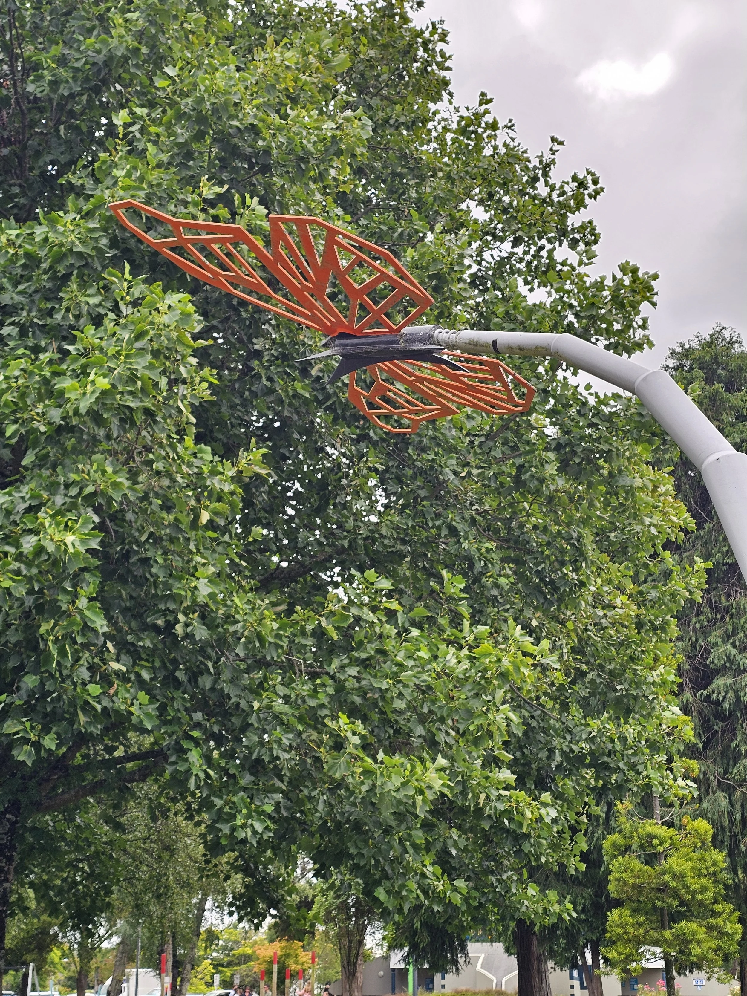 BUTTERFLY, originally entered in the 2014 Secondary Schools Sculpture Competition, is a wind-responsive piece inspired by the Monarch butterfly. Suspended from a flexible cantilevered support, it gently moves with the breeze. Positioned at the entrance to the South Domain gardens, it celebrates our natural environment and highlights the decline of Monarch populations. Designed by a Taupō student, it stands as a vibrant reminder of youth creativity in our community.