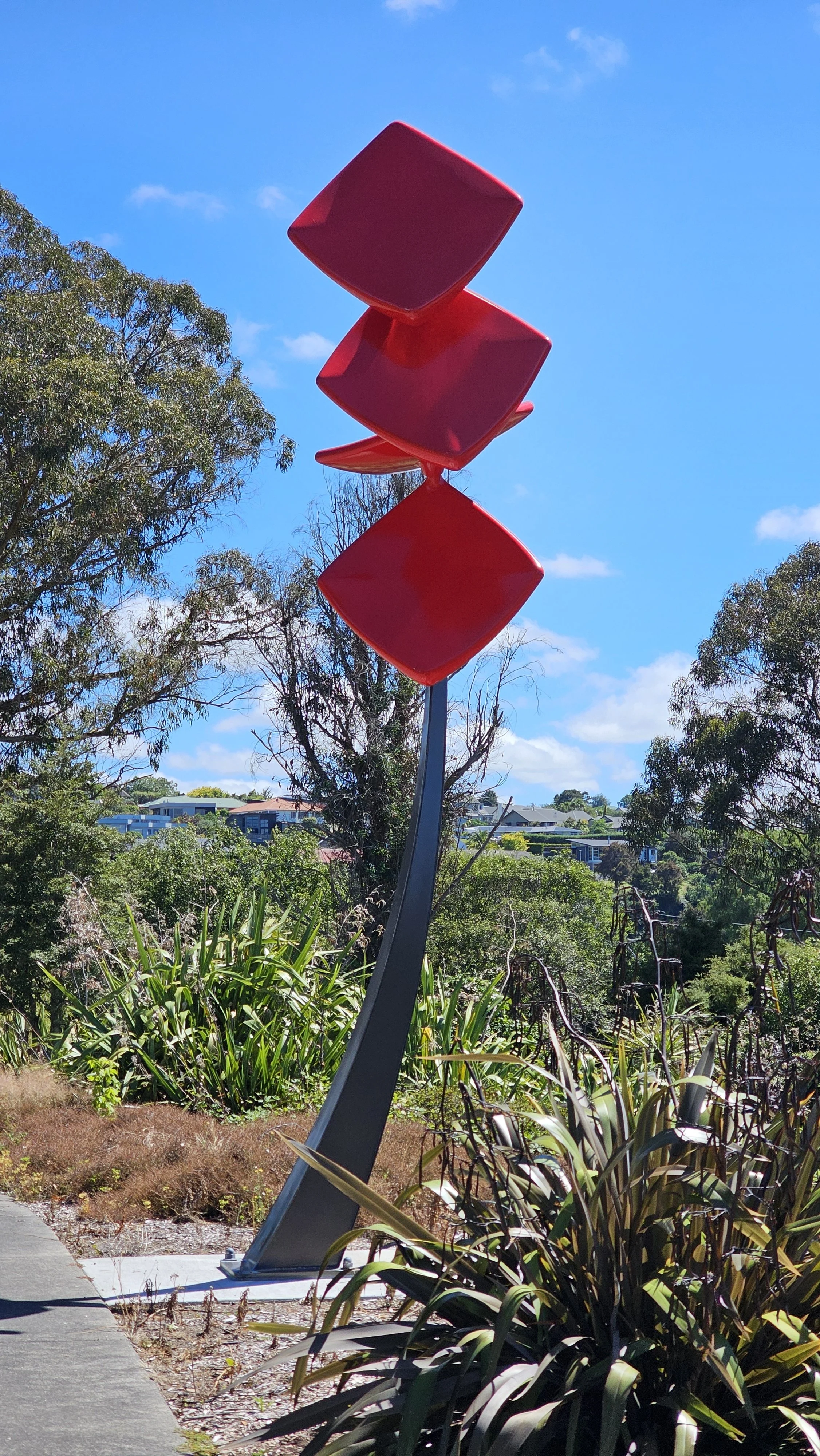 This contemporary sculpture features a tall steel pole, a precision-engineered head, and four red tablets balanced to stand still in calm conditions, reaching 7 metres high. When the wind picks up, the tablets twist and rotate independently in endless variations. Created by renowned kinetic artist Phil Price, FLIP is built to withstand extreme outdoor conditions and now joins his other celebrated works across New Zealand and Australia.